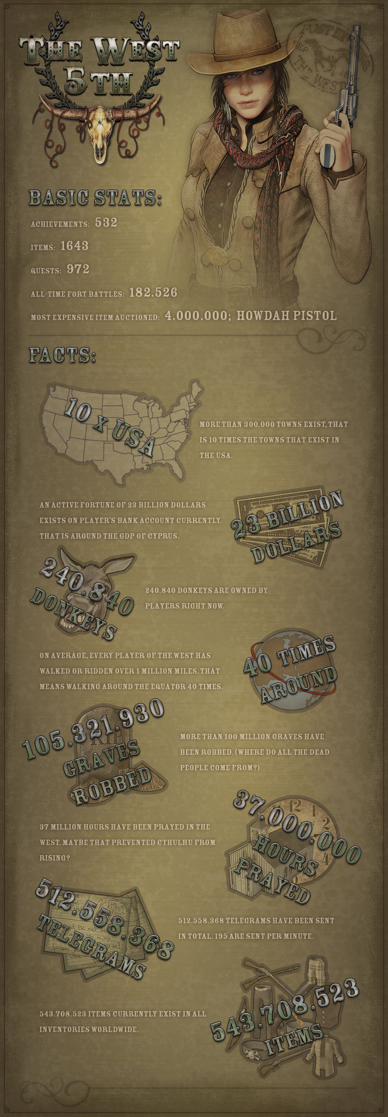 InnoGames, Ă©diteur et dĂ©veloppeur de jeux vidĂ©o en ligne fĂȘte le cinquiĂšme anniversaire de son jeu de Western populaire, The West. Jusquâau 7 Mai prochain, les as de la gĂąchette sont invitĂ©s Ă sâessayer Ă la quĂȘte SpĂ©ciale Anniversaire. RĂ©compenses : bonus dâexpĂ©rience, cadeaux Ă foison et succĂšs. Cerise sur le gĂąteau: des Bons trĂšs rares crĂ©diteront les comptes des joueurs qui totalisent le plus dâheures de jeu.